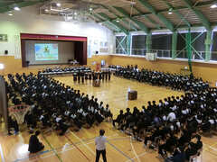 第2回生徒総会。一堂に会しての総会会場が雰囲気をより引き締めます。以下、生徒会長の「義の心」と「active change」についての総括を紹介します。「義の心」には、思いやりをもつことや大切なものに尽くす姿勢、「active change」には、自ら行動し、より良い学校をつくろうとする意志を表してきました。みなさんがそれぞれの役割を果たし、数々の行事を成功に導いたことで、集団としての団結力が高まりました。一方で、遅刻や交通ルールの遵守といった日常生活の面では、まだ改善すべき課題も残されています。より良い集団を目指し、今後も全員で取り組みを続けていきましょう!!